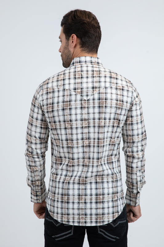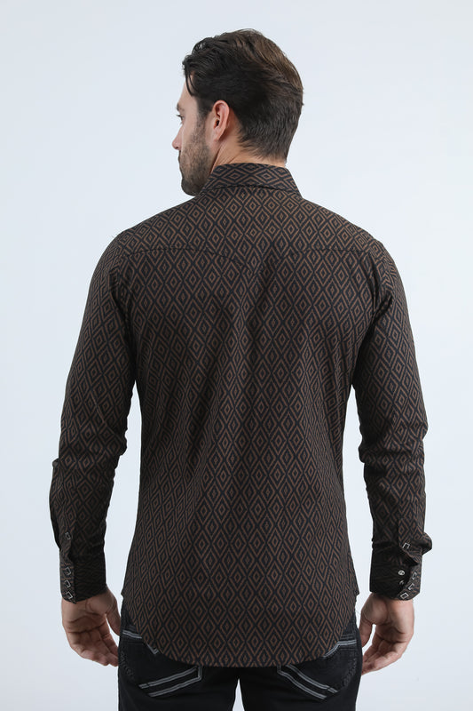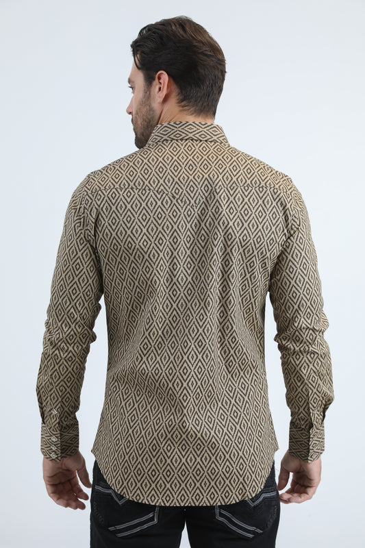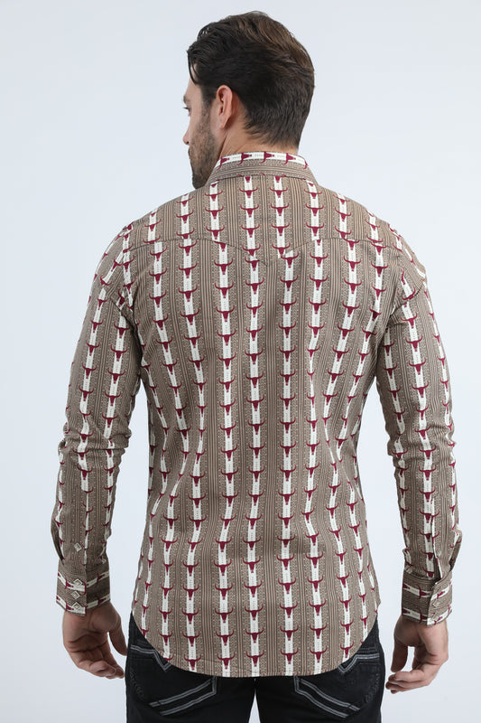 Mens Western Modern Fit Cotton/Spandex Long Sleeve Brown Shirt with Snaps