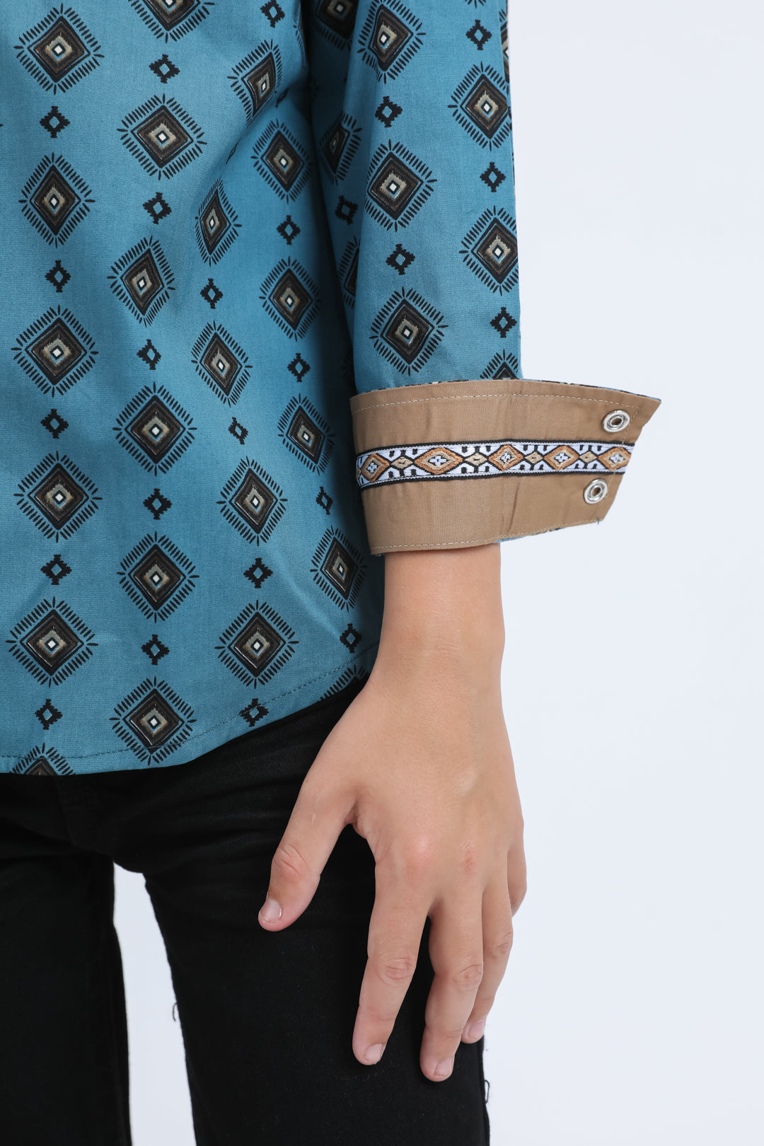 Kid's Western Modern Fit Cotton/Spandex Long Sleeve Blue Shirt with Snaps
