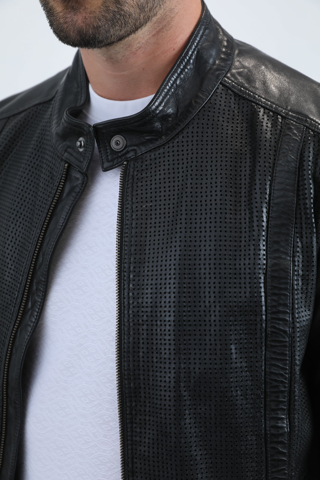 The defining feature of this jacket is the unique perforated leather paneling on the body and sleeves. This texture adds a sporty, breathable, and visually striking element, setting it apart from standard leather jackets. The clean, band/stand-up collar with a snap-button closure maintains a sleek biker silhouette, while the full front zipper ensures easy wear.