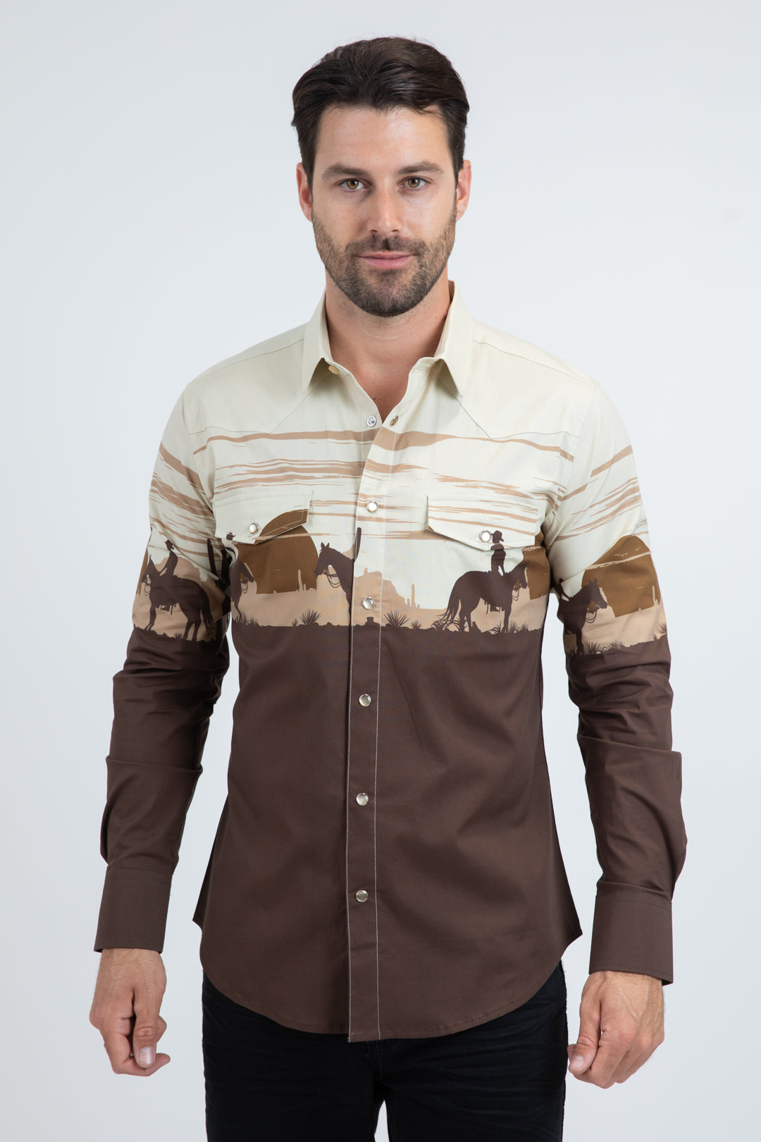 Men's Modern Fit Cotton Stretch Rodeo Panoramic Print Brown Shirt