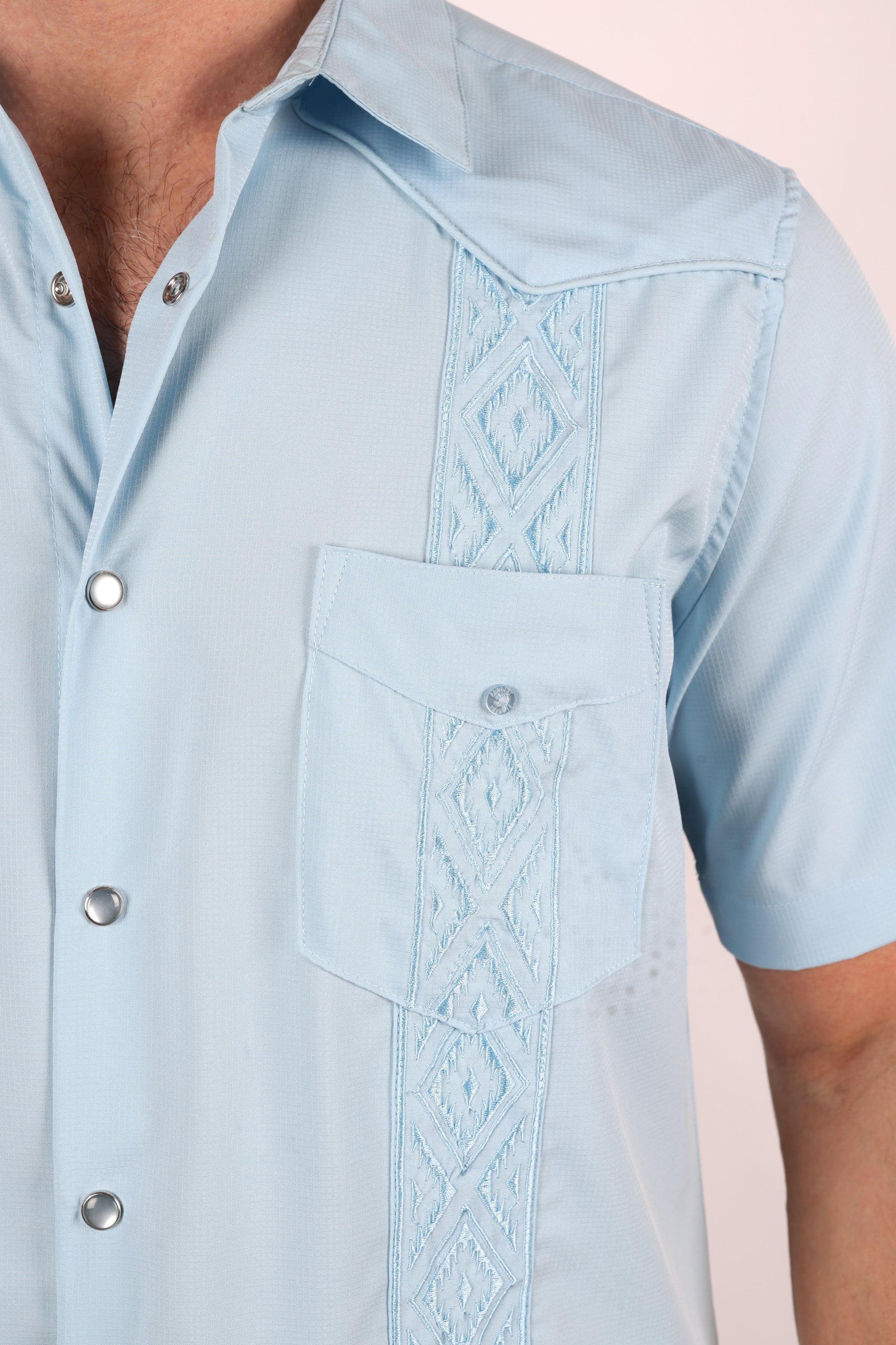 Elevate your warm-weather wardrobe with our Men's Modern Guayabera Shirt, designed to keep you cool and stylish in the heat. Crafted from breathable and lightweight fabric, this shirt features traditional Aztec embroidery and four pocketed-details for added functionality. The relaxed camp collar and pintuck detailing offer a touch of sophistication, ensuring you look and feel your best no matter the occasion.