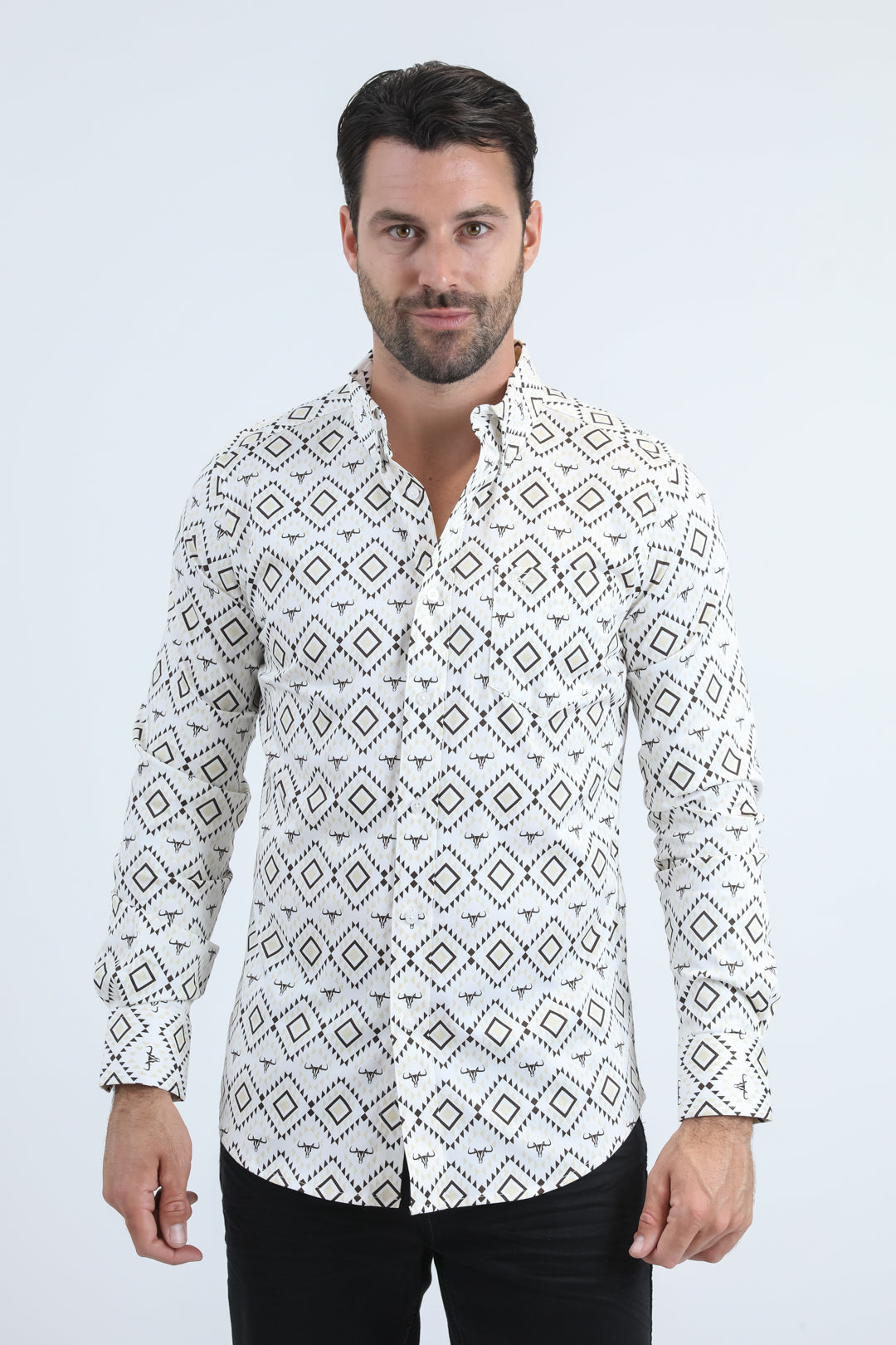 Elevate your wardrobe with our Men's Satin Cotton/Spandex Modern Fit Long Sleeve Shirt. This Cotton Print Dress Shirt is a versatile choice for any occasion, offering a comfortable fit with stretch cotton material.