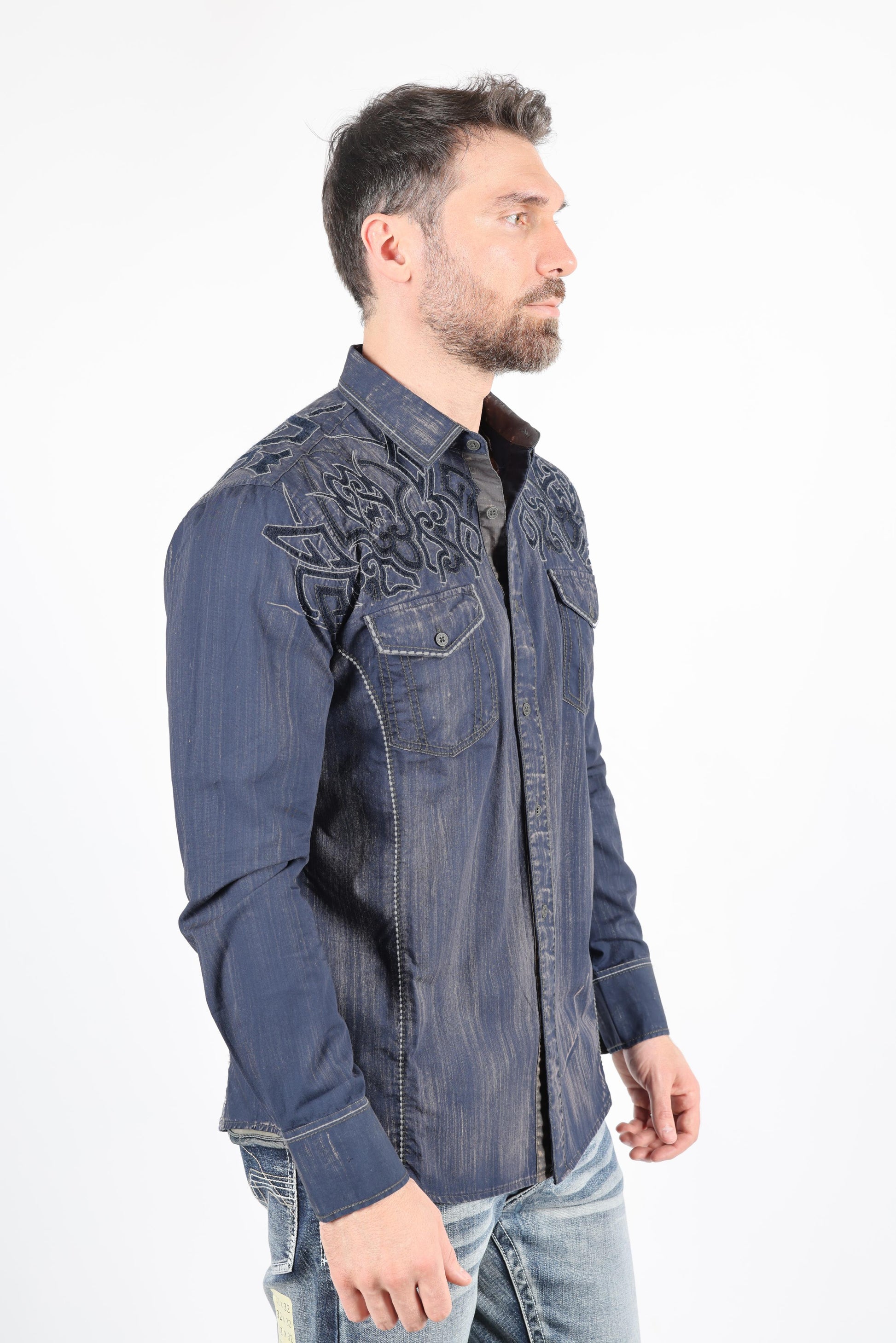 Mens Vintage Washed 2-tone Embroidery Modern Fit Stretch Shirt