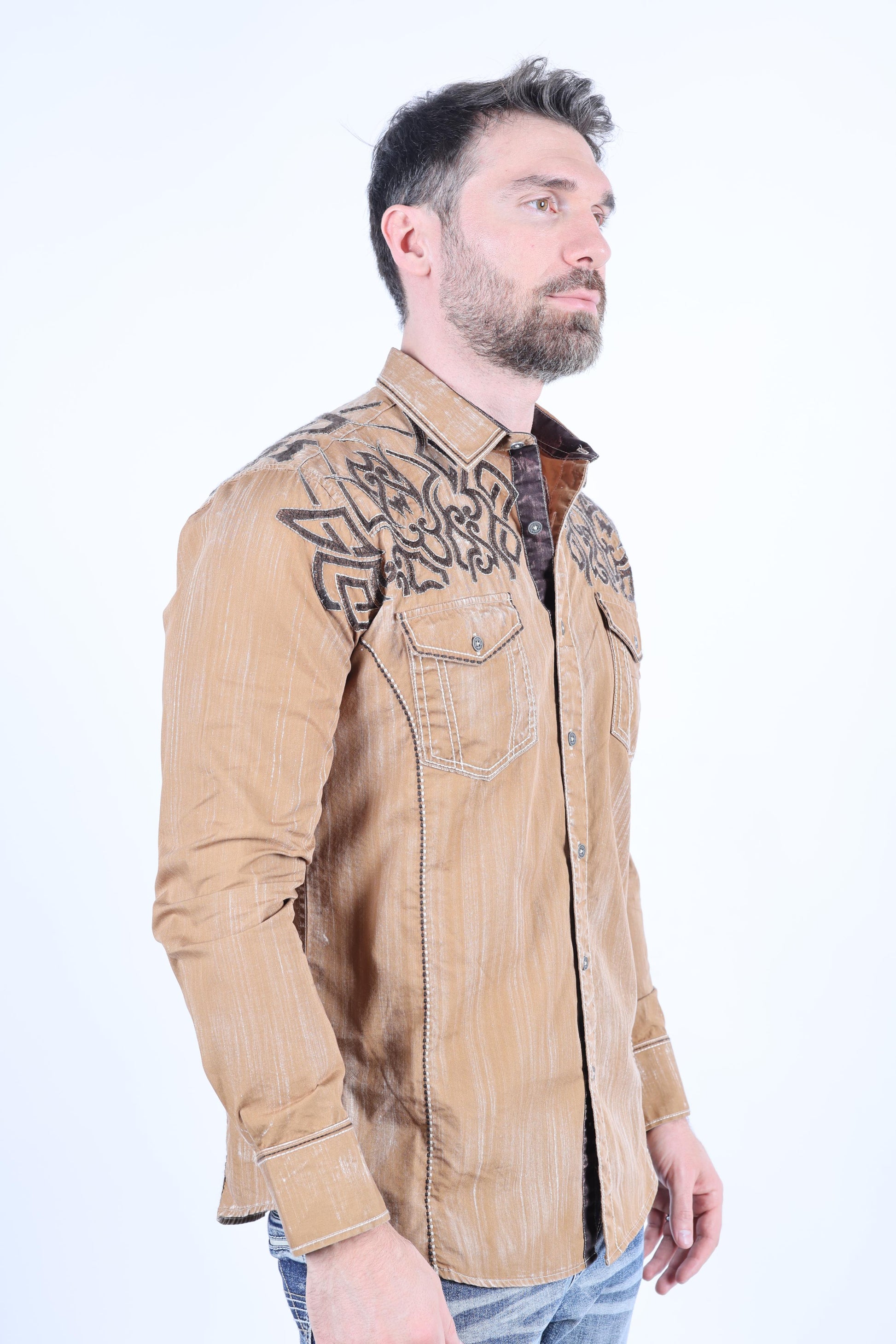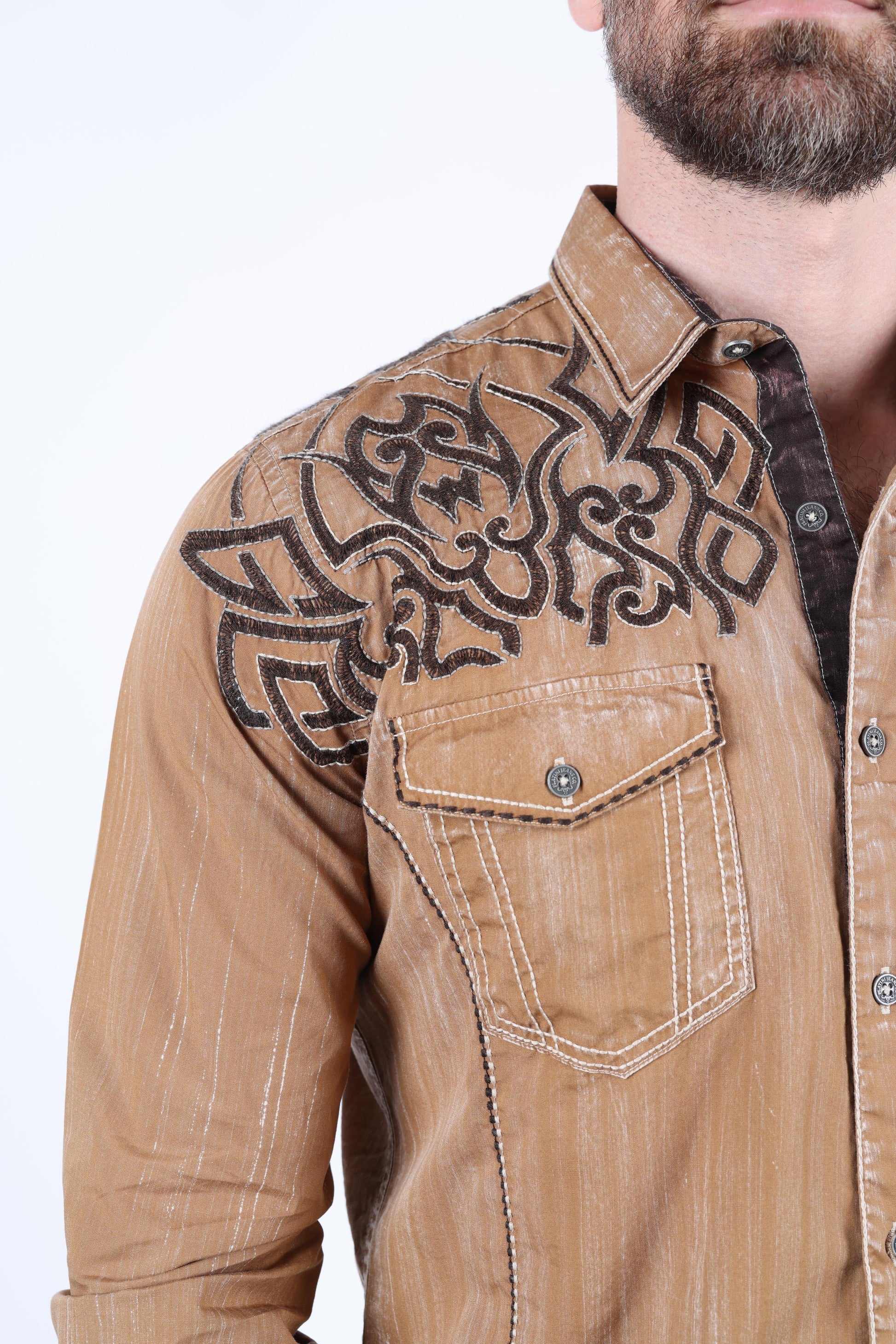 Mens Vintage Washed 2-tone Embroidery Modern Fit Stretch Shirt