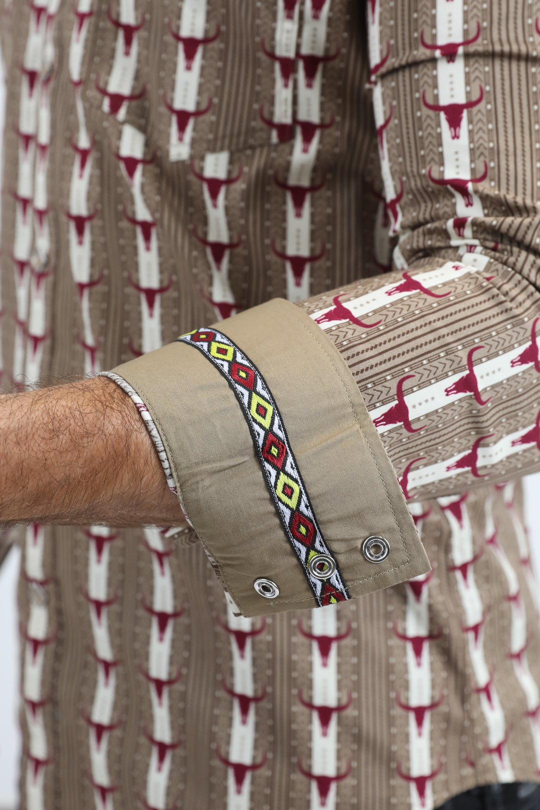 Mens Western Modern Fit Cotton/Spandex Long Sleeve Beige Shirt with Snaps
